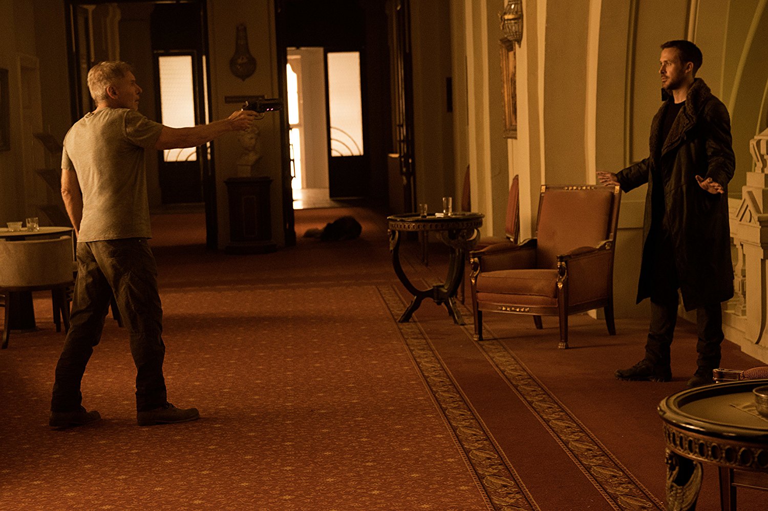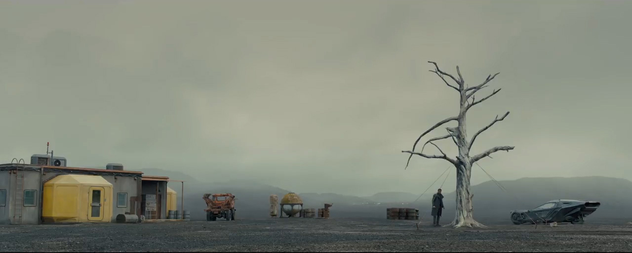 Villeneuve, juntamente com os roteiristas Michael Green e Hampton Fancher (que havia trabalhado no roteiro do primeiro filme), nos leva novamente a uma Los Angeles caótica, como no primeiro filme, mas aparentemente ainda mais destruída, já que trinta anos se passaram. A fotografia de Deakings em uma majestosa harmonia com o incrível detalhamento do designer de produção Dennis Gassner expande ainda mais o cenário que havíamos visto no primeiro filme, com enormes planos abertos, marca registrada de Deakins, belamente enquadrando as mejestosas edificações em contraponto a espaços desérticos, geralmente em tons amarelados que reforçam a poluição tóxica no ambiente, e até mesmo as cenas em locais fechados mostram grandes salões sem muitos detalhes. Lembro especialmente de uma sala onde Luv (Sylvia Hoeks), replicante braço direito de Wallace, reúne-se com um cliente e tem as quatro paredes iluminadas por grandes reflexos de luz em uma água sempre em movimento. Em contrapartida aos cenários limpos do interior das edificações, as ruas de LA, sempre cheias de vendedores ambulantes e quinquilharias, assim como no primeiro filme, aqui se mostram ainda mais deterioradas, os marcantes e enormes letreiros em neon do primeiro filme são referenciados e até repetidos aqui, como o enjoy Coca-Cola e o Atari brilhante. Outro ponto positivo no incrível design de produção é a utilização de aparelhos tecnológicos ainda bem parecidos com os do primeiro filme, deixando claro que, apesar dos anos decorridos, o black out de anos atrás deve ter causado um atraso no desenvolvimento de novas tecnologias. Assim é justificada a estilosa utilização de monitores de tubo e telefones com fio que tanto marcaram o visual do primeiro filme. Mas, todas estas referências estão inseridas de forma totalmente orgânica e funcional, não operando apenas como lembrança de que há um filme anterior a ser referenciado.